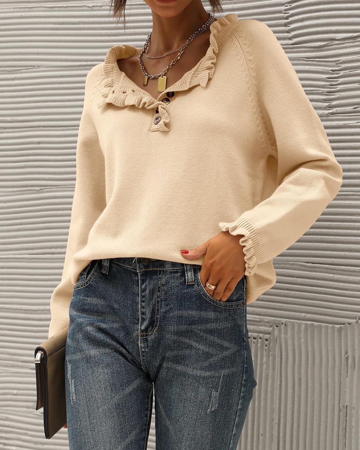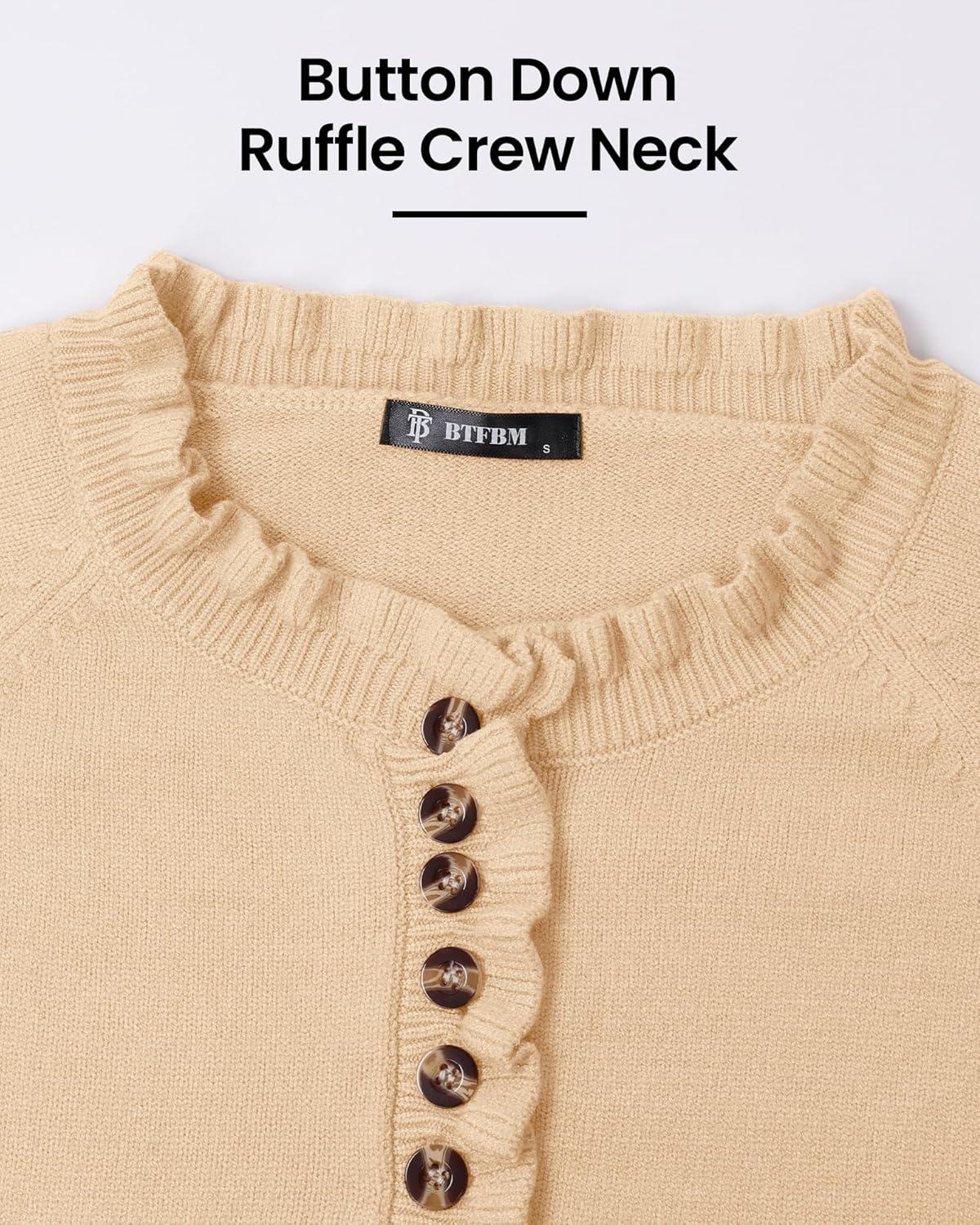 BTFBM Womens Sweaters Fall Winter Clothes 2025 Long Sleeve Button Down Ruffle Crew Neck Casual Knitted Pullover Tops(Beige)