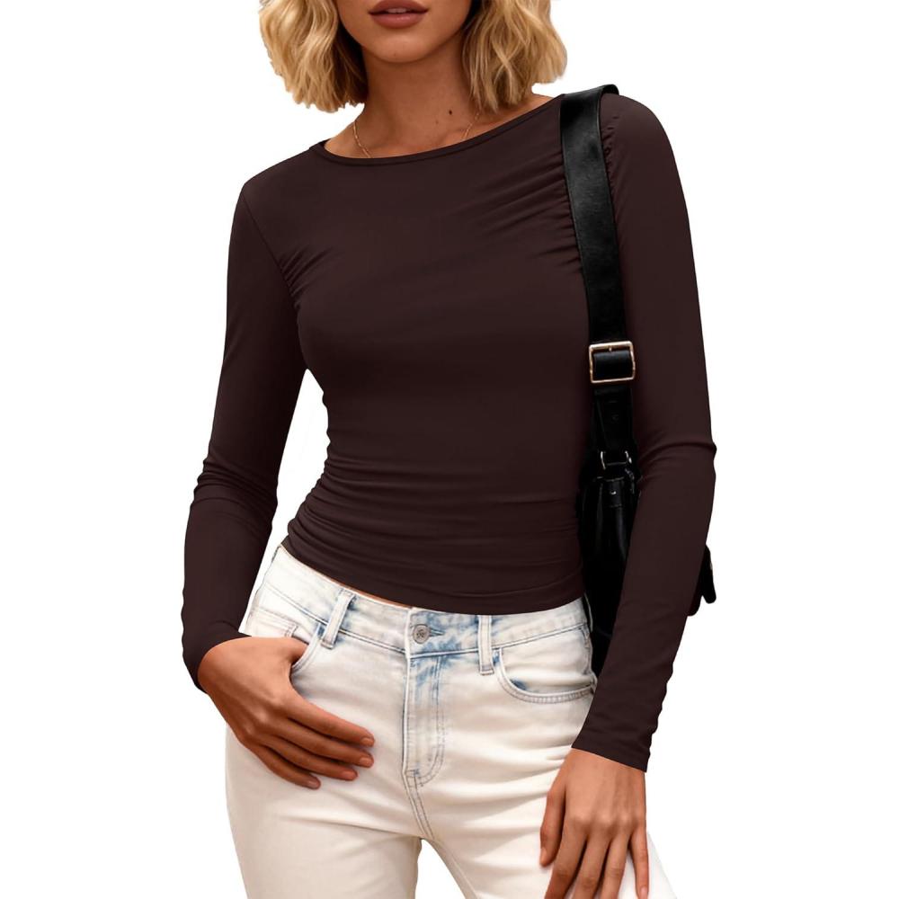 imageBTFBM Womens Tops 2025 Fall Clothes Long Sleeve T Shirts Boat Neck Ruched Slim Fit Casual Stretchy Going Out OutfitsBrown