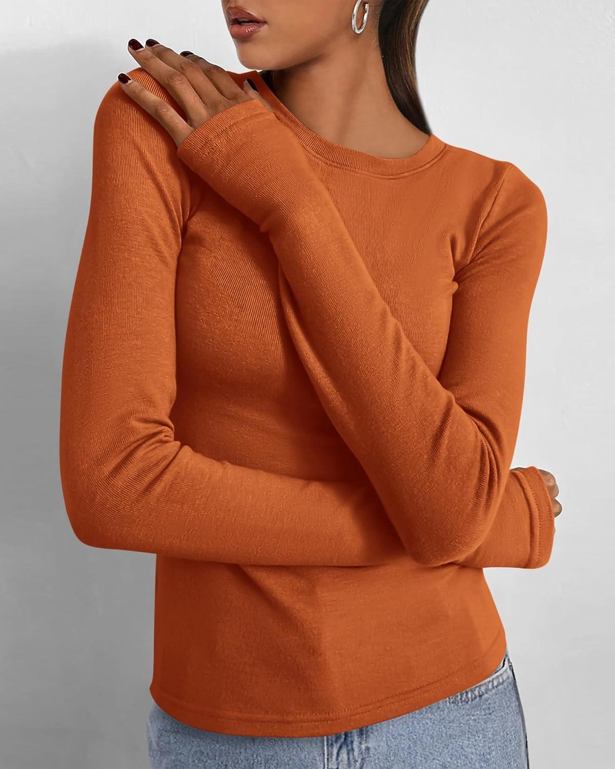 BTFBM Womens Tops 2025 Fall Outfits Long Sleeve Shirts Crewneck Work Blouses Stretchy Slim Fit Going Out Top Workout(Brick Red)