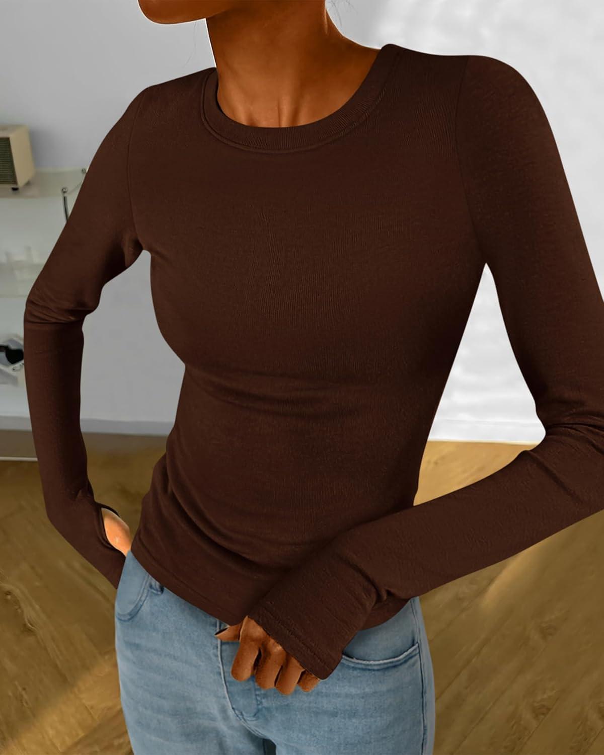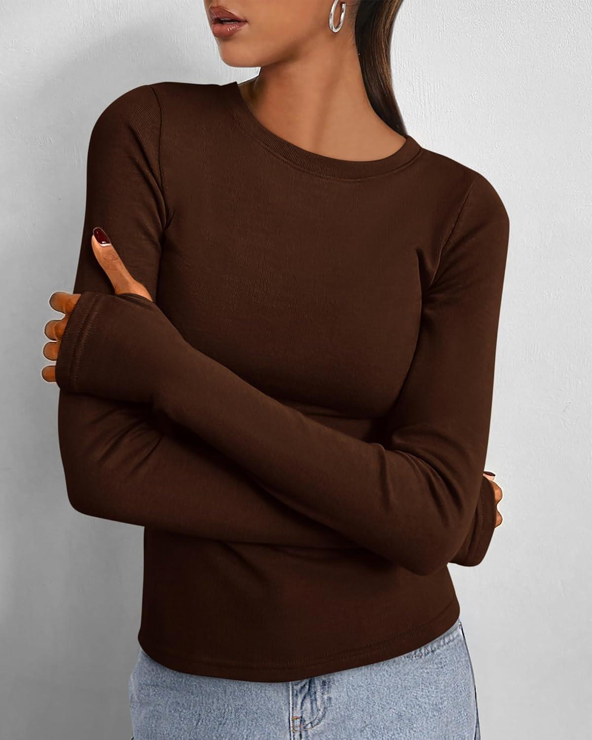 BTFBM Womens Tops 2025 Fall Outfits Long Sleeve Shirts Crewneck Work Blouses Stretchy Slim Fit Going Out Top Workout(Coffee)