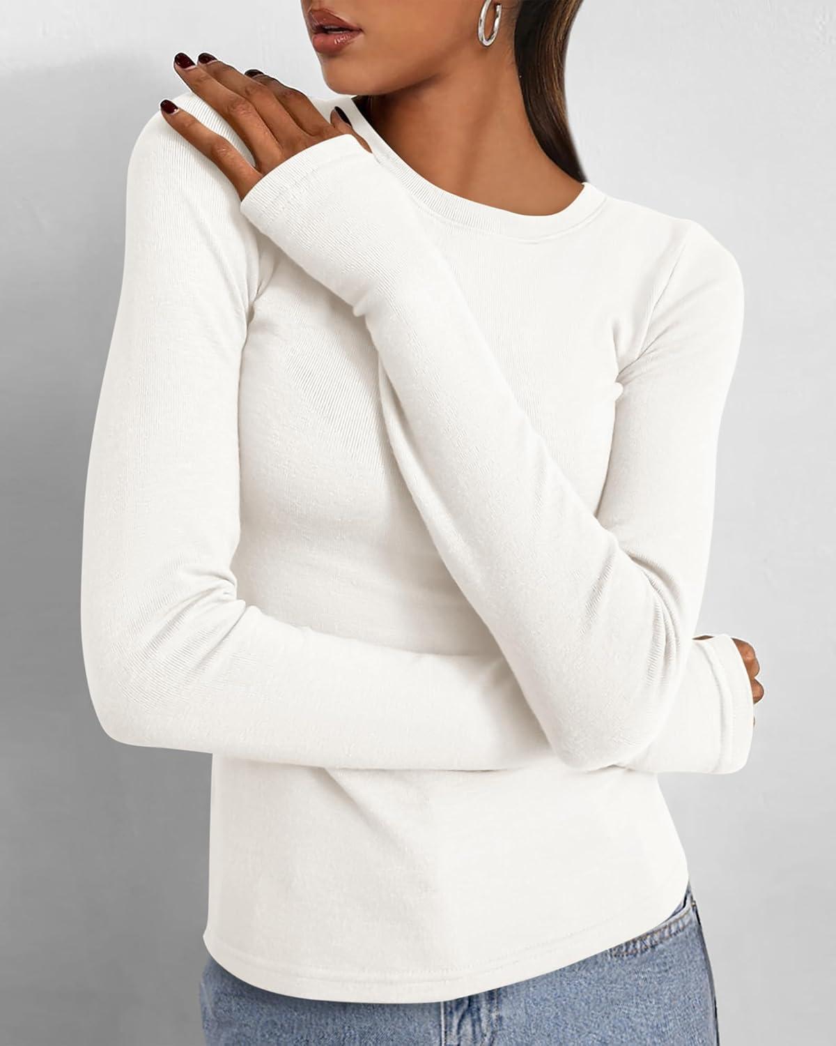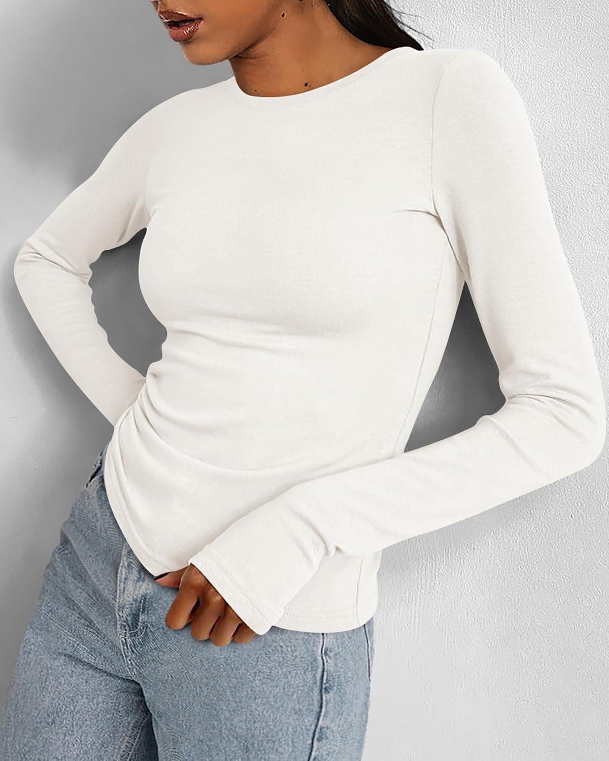 BTFBM Womens Tops 2025 Fall Outfits Long Sleeve Shirts Crewneck Work Blouses Stretchy Slim Fit Going Out Top Workout(White)