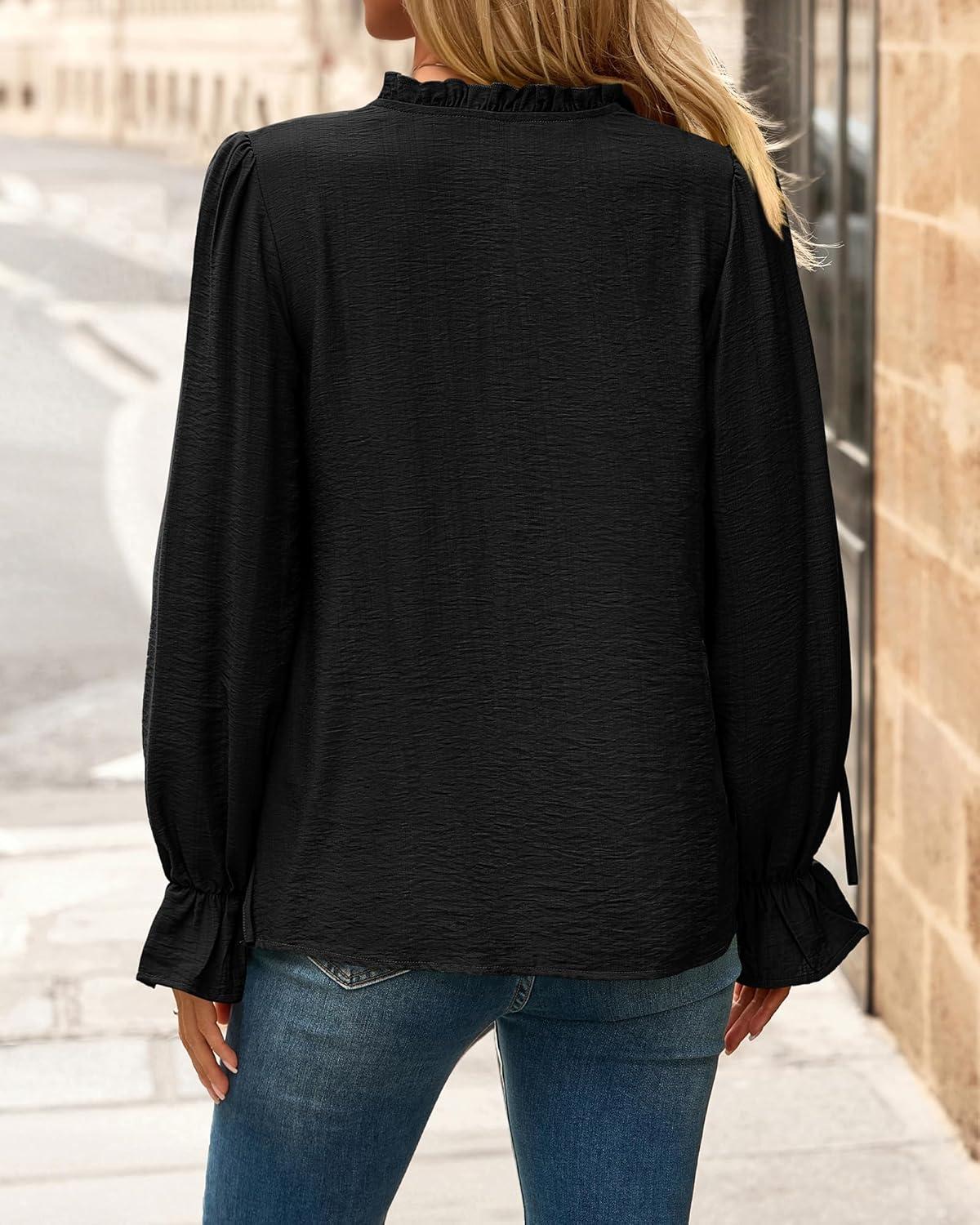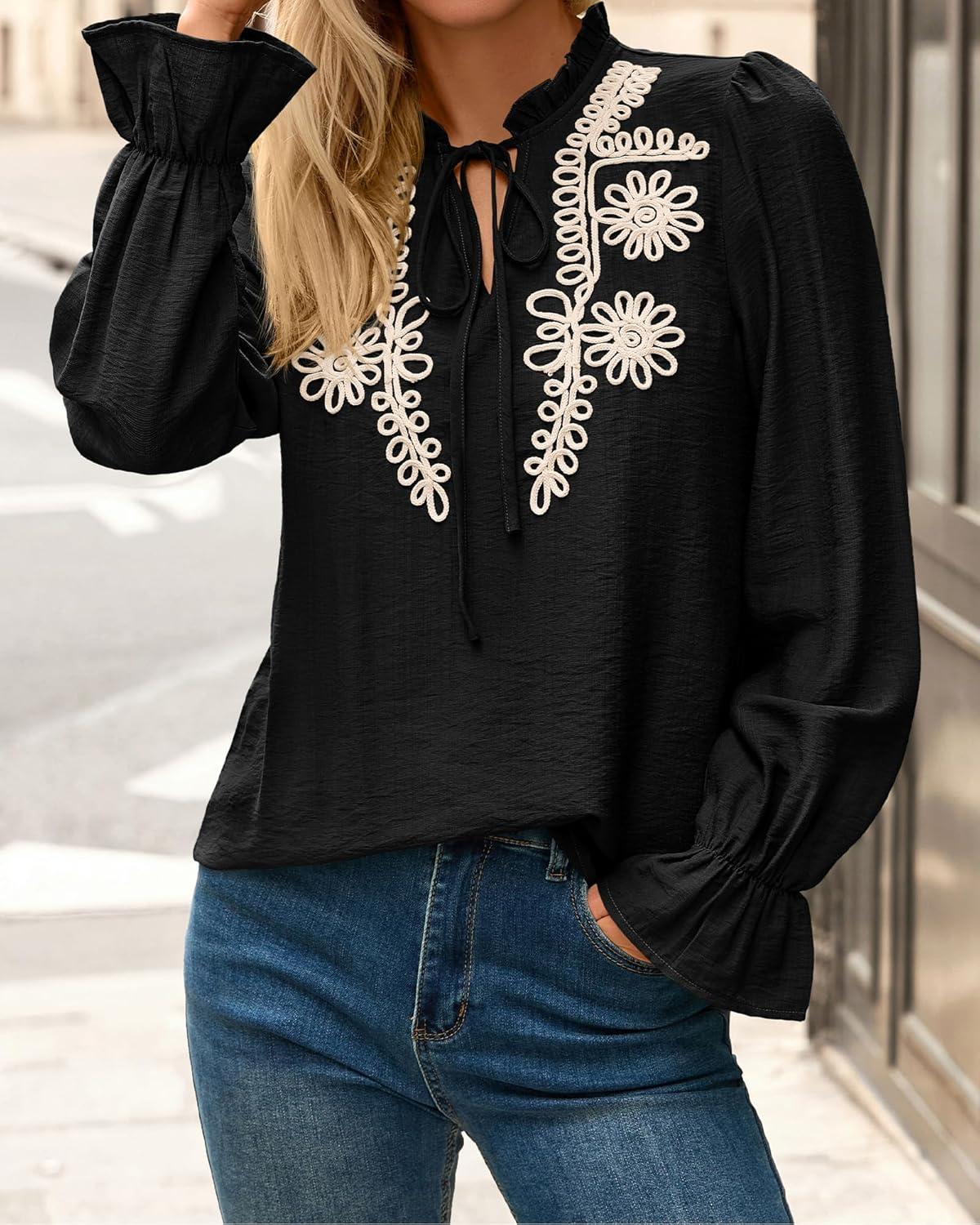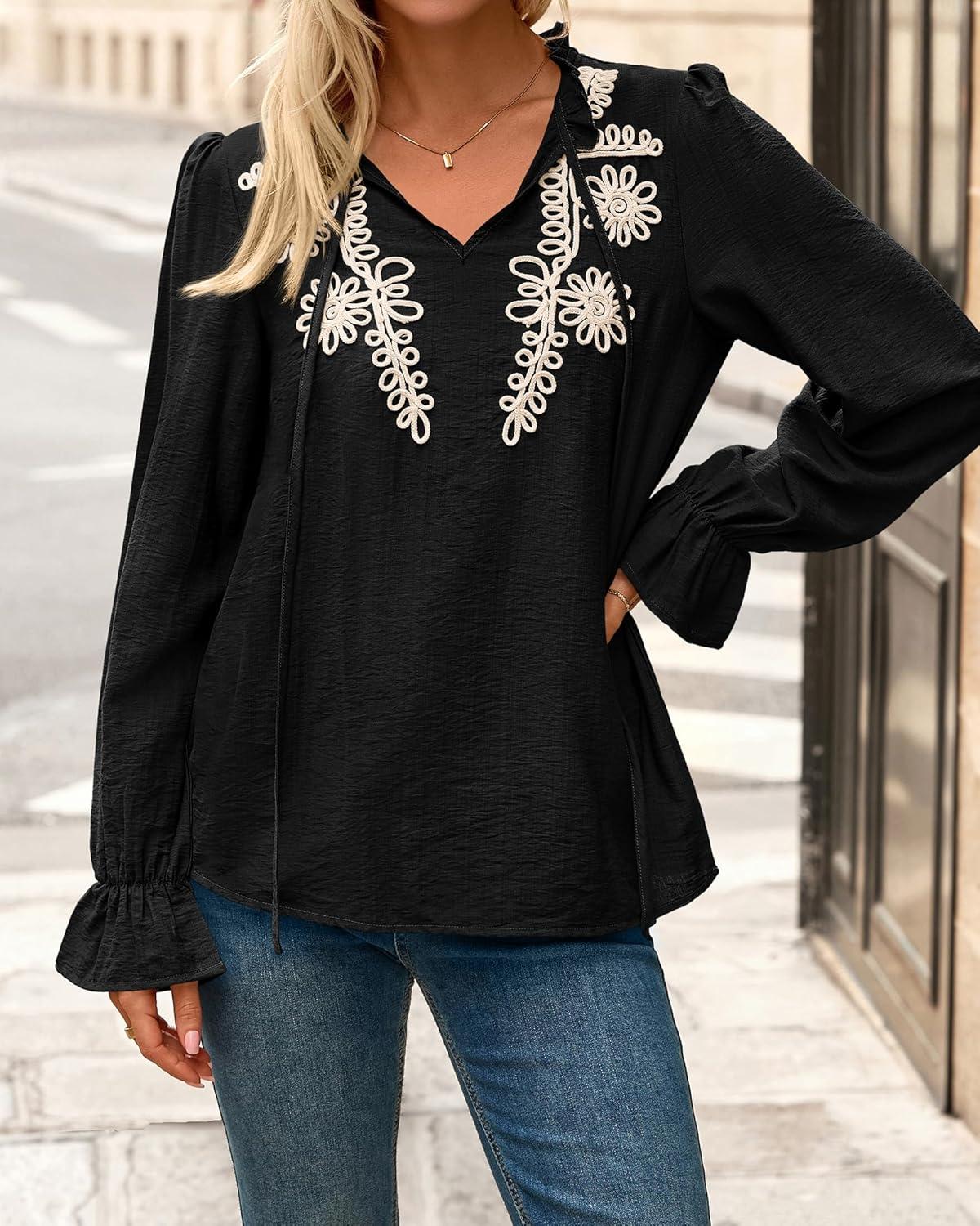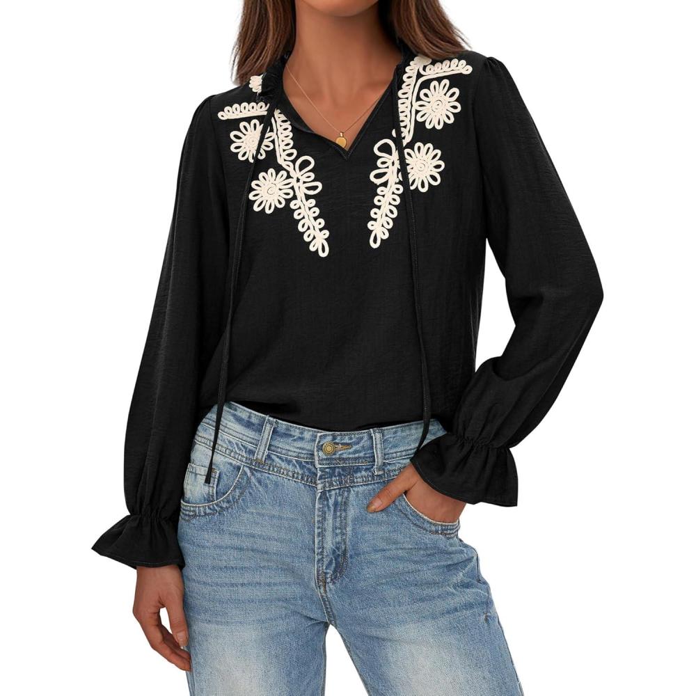 BTFBM Womens Tops Dressy Casual Fall 2025 Boho V Neck Ruffle Long Sleeve Shirts Floral Embroidered Work Business Blouses(Black)
