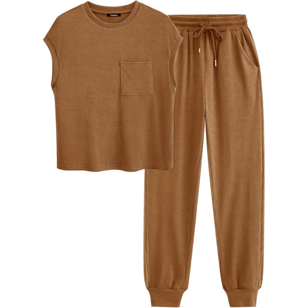 BTFBM Women’s Two Piece Tracksuit Outfits Summer Short Sleeve Tops Long Pants Jogger Lounge Matching Sets Sweatsuit(Solid Dark Khaki)
